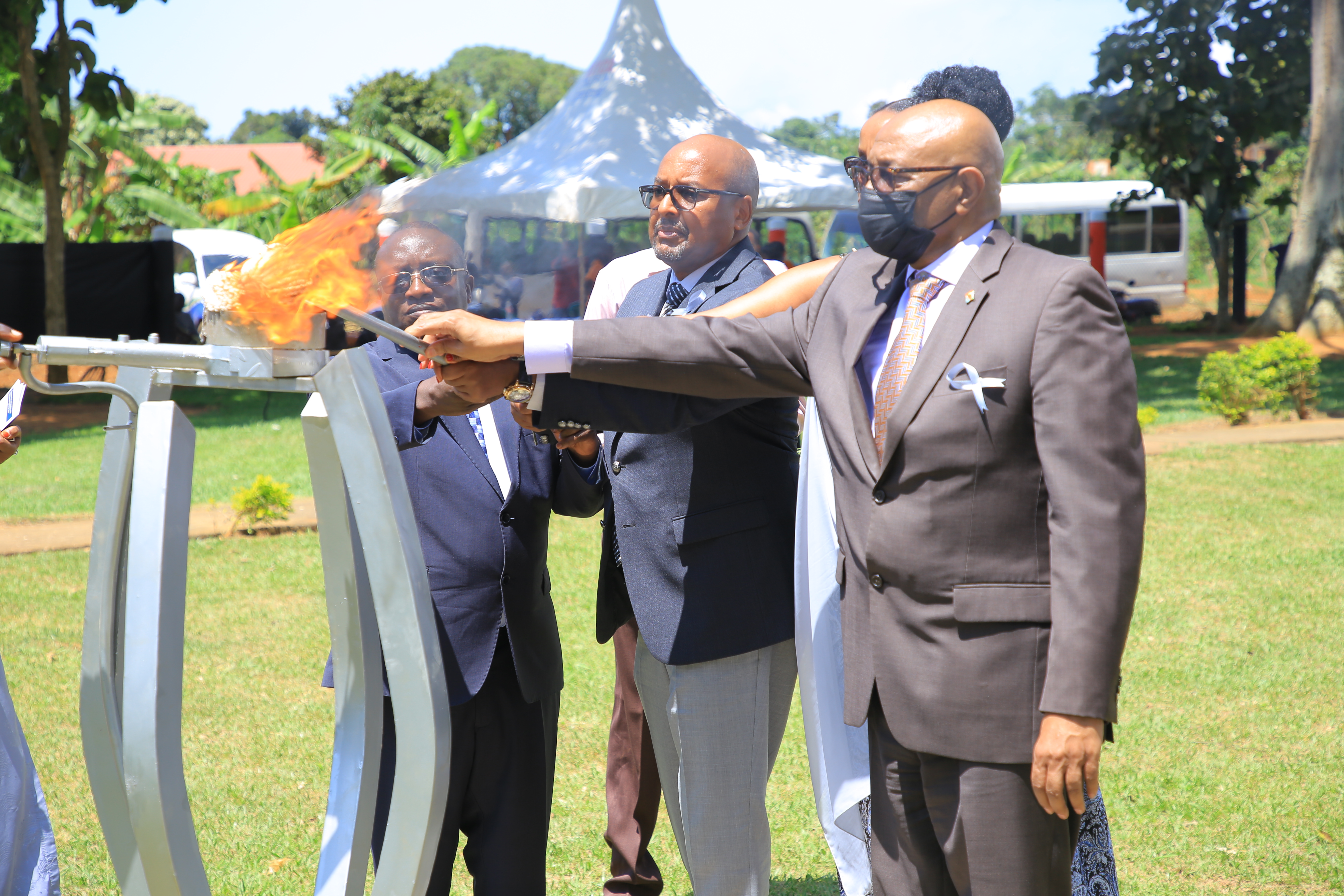 Rwanda’s High Commissioner of Rwanda to Uganda Joseph Rutabana together with guest of honourAmbassador Julius Kivuna, the Head of Regional Peace and Security at Uganda’s Ministry of Foreign Affairs and diplomats lit a flame of remembrance.